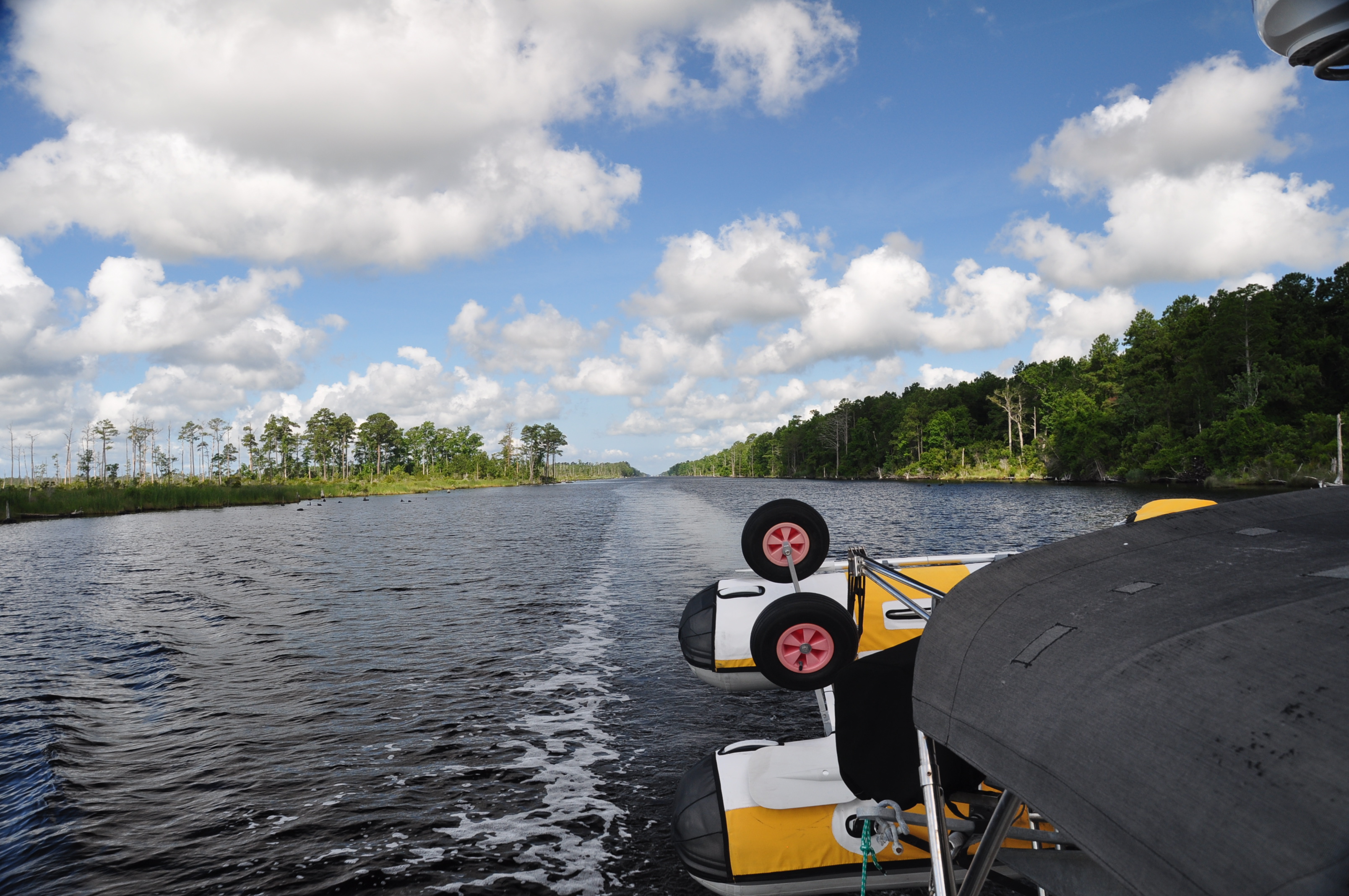 Leaving Beaufort, we headed up the ICW on the inside of the Outer Banks (avoiding rounding Cape Hatteras) and planned to go toward Manteo, North Carolina (which is near Kitty Hawk). We motored up the Alligator – Pungo River along a narrow swath of water, bordered by trees and wildlife and the water was so calm we could see our boat’s reflection as we meandered along.